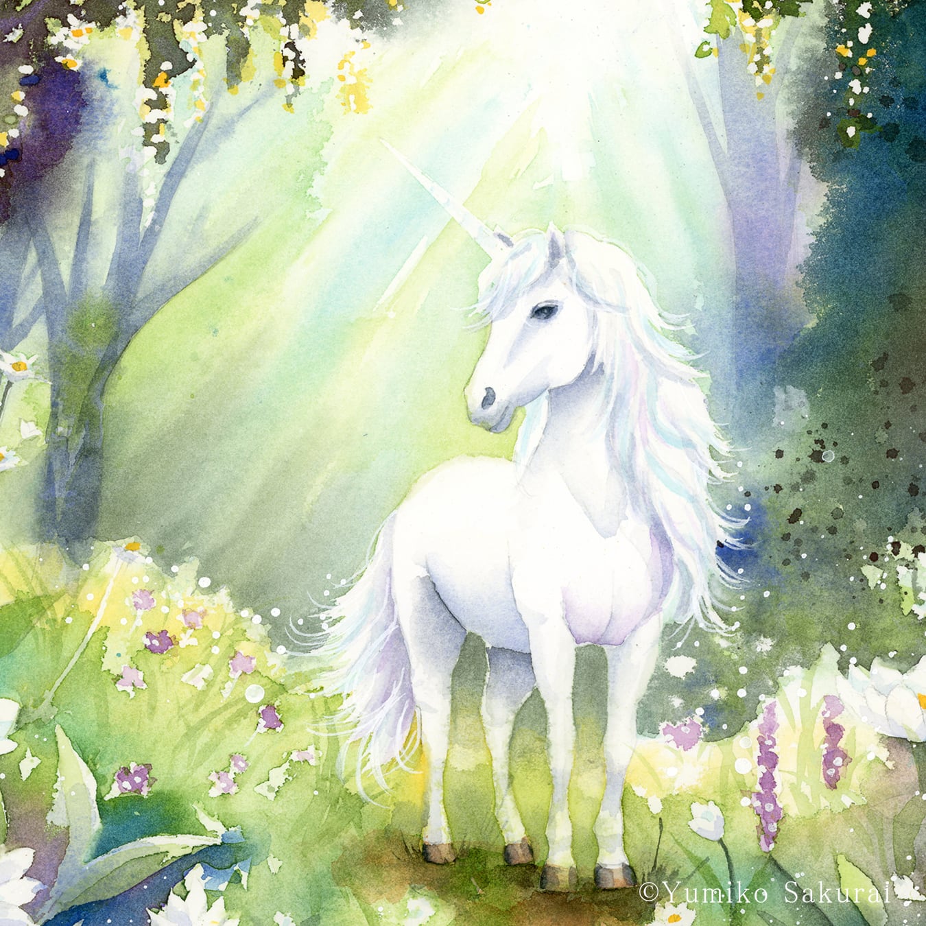 原画 『 ユニコーン ~光の森~ 』 水彩画 ユニコーンの絵